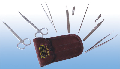 用于鸟类小动物解剖。材质:不锈钢。 包括:1支解剖针,1把小号解剖柳叶刀,1把大号解剖柳叶刀,1支解剖镊子,1把解剖弯镊,1把解剖直剪,1把解剖弯剪。